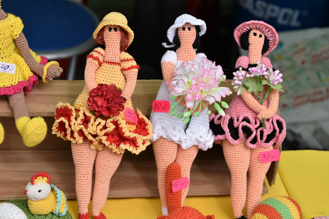 Jarmark był, taki na bogato, przyjechali wystawcy z różnych zakątków kraju i zza wschodniej granicy. Jak co roku "działo się" na ludowo i kolorowo, tylko pogoda spłatała sporego figla, gdyż w sobotę co chwilę padało, ale niedziela była już ok. My jakoś tak dziwnie wędrowaliśmy w tym roku po jarmarku, lekko chaotycznie, za szybko, co odbiło się na mizernych zakupach, mimo wielkich planów. Sobie kupiliśmy tylko dwa kute wieszaczki do łazienki, podobała mi się jeszcze ceramika w kolorze jasnej mięty, ale odpuściłam, gdyż nasz dom i tak tonie w drobiazgach. Ola ze swoją przyjaciółką Igą za to podjadały bez przerwy, co tam tylko oferowały "kulinarne" stragany. Igor wyprosił z kolei duży drewniany miecz, z którym biegał później do wieczora po podwórku. Mało było w tym roku stoisk z roślinami, a chciałam kupić różnokolorowych floksów i pysznogłówek, no nic ... może następnym razem :) w ogrodzie też mam przecież zagracisko.